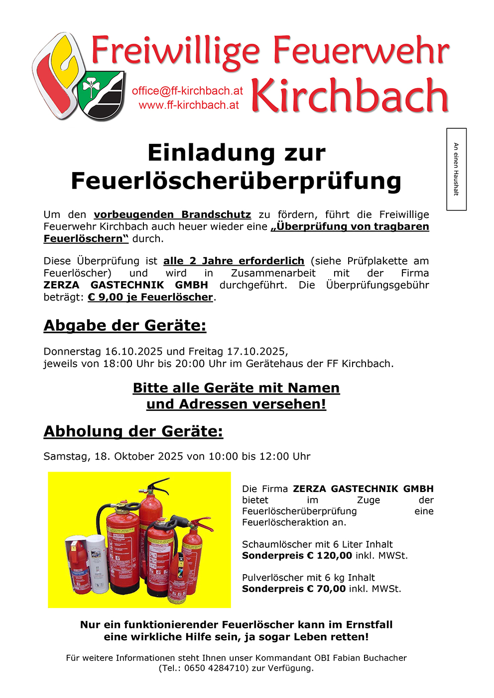 Einladung zur Feuerlöscherüberprüfung 2025 Donnerstag, 16. Oktober 2025 - Einladung zur Feuerlöscherüberprüfung 2025 Weiterlesen: Einladung zur Feuerlöscherüberprüfung 2025